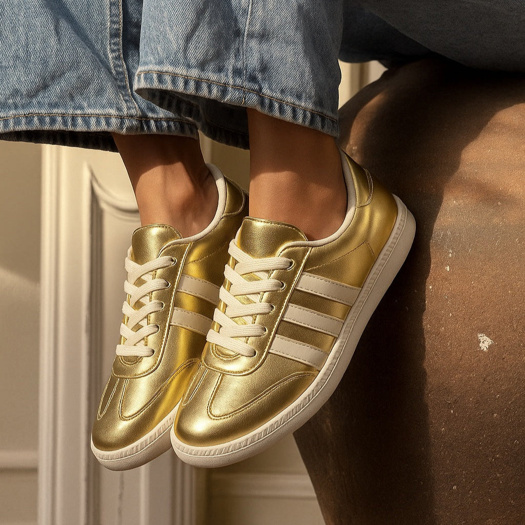 These women’s gold sneakers combine comfort with bold, stylish design.